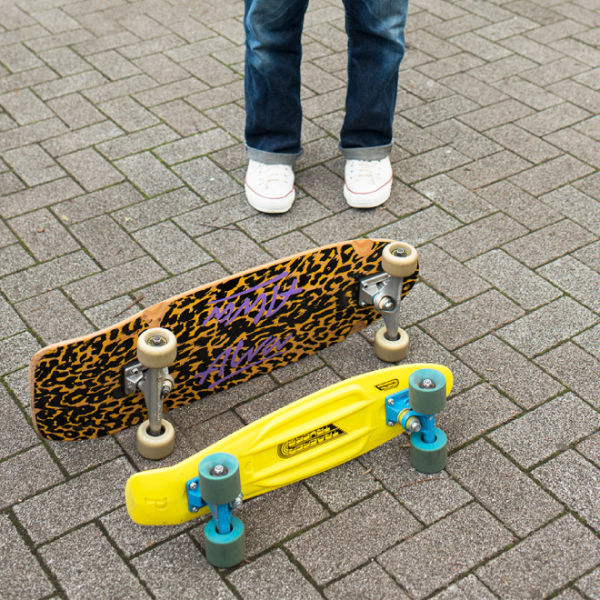 たとえば大きいほうが乗りやすいけど持ち運びはしづらいよネ?持ち運びする時間が多い人は小さい方がいいけど、乗りづらいんだョ。あとは、トリックを決めたいのか、移動手段として使いたいのか、それによって変わるよネ。」