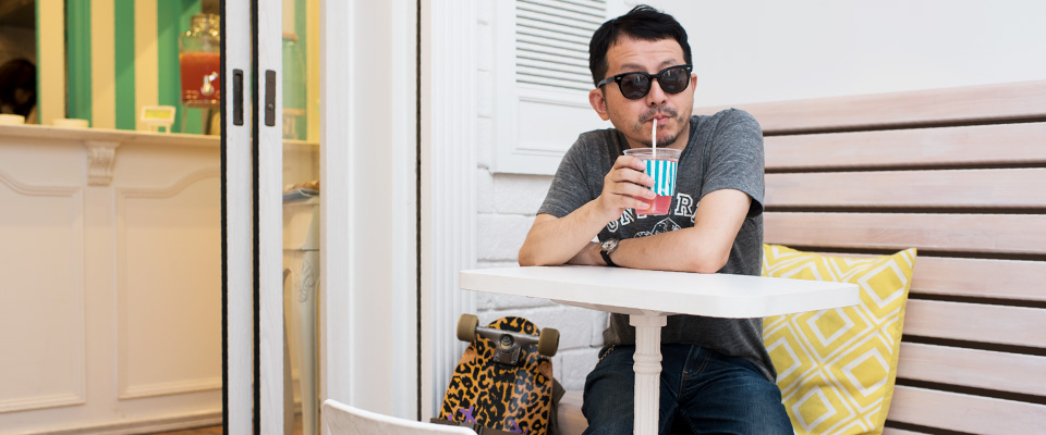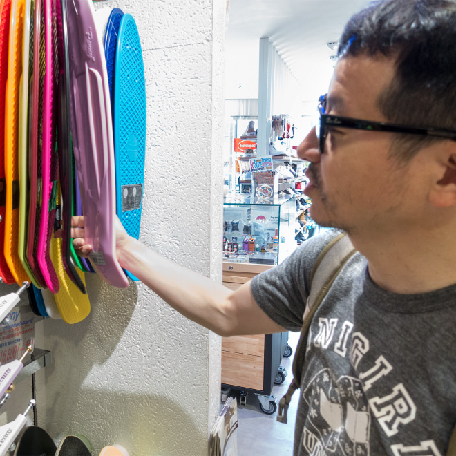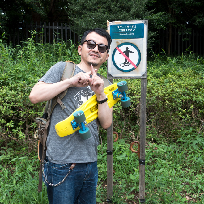 「30代半ばくらいの頃だったかナ。ちょうど『ドッグタウン&Zボーイズ』のドキュメントが日本公開されたり、下北沢ZOO~SLITSの山下直樹さんがスケボー乗っているのを見かけたり、再開したいナって思ったんだョ。クルージングっていう、特にトリックをするんじゃなく、自由に走り回るスタイルもありなんだって思えてネ」