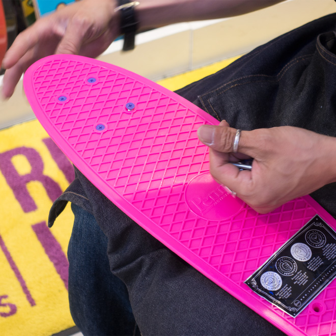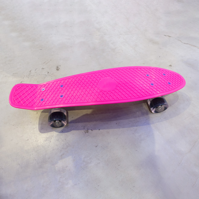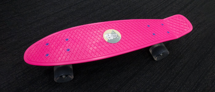 「これは Penny って、オーストラリアのメーカーのミニクルーザーってタイプのスケボーだョ。小さいからちょっと難しいけど、ちょうど良いスリルが味わえるんだョ」。