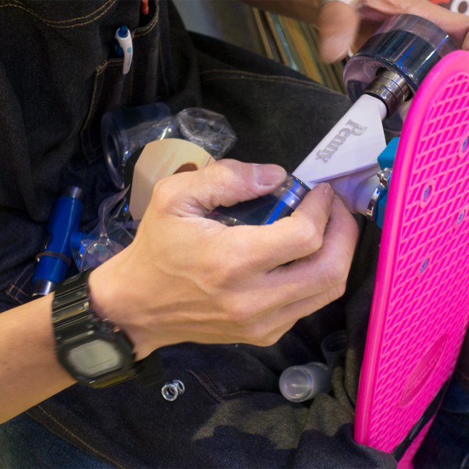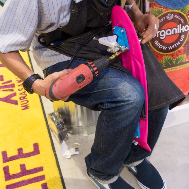 普通に組み立て済みのものは、13,800円~でしたが、好きな色の組み合わせができるのは超楽しい!サイダーKに説明を受けながら、デッキ、トラック、ウィール、ハードウエア(ネジ)と選んでいきます。ネジまで色が選べるのが芸が細かくていいですね。