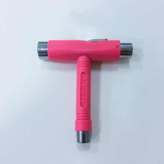 このキングピンナットを調整するための道具がこちら。デッキに合わせてピンクにしました。800円。クロスバイクもそうなんだけど、乗り物が増えると、道具も増えていくなあ。